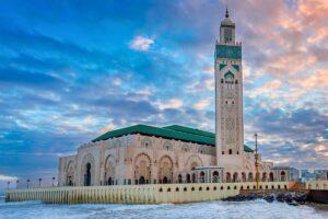 The crescendo of your Moroccan journey awaits at the majestic Hassan II Mosque. Rising dramatically from the Atlantic’s edge, this architectural masterpiece stands as one of the modern wonders of the Islamic world. Marvel at its soaring minaret – the world’s tallest – piercing the sky at 689 feet. Inside, discover an awe-inspiring blend of Moroccan craftsmanship and modern engineering, where hand-carved cedar ceilings, brilliant zellij tilework, and intricate marble floors create a space of breathtaking beauty.