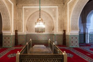 A short drive brings you to Meknes, where the grandeur of Morocco’s imperial past awaits. Here, you’ll discover the architectural marvels of Sultan Moulay Ismail’s vision. Marvel at the sheer scale of Heri es Souani, an ingenious complex of granaries and stables that once housed 12,000 royal horses. Descend into the haunting depths of Prison de Kara, where the tales of Barbary Pirates and their Christian captives still seem to linger in the shadows. Your journey through Meknes culminates at the magnificent Mausoleum of Moulay Ismail, a testament to Morocco’s enduring royal legacy.